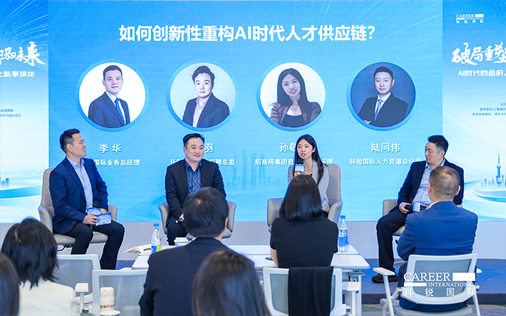 圆桌讨论环节,由k8凯发国际国际业务总经理李华主持,开利亚太总部招聘总监邹羽、招商局集团资深AI产品经理孙敬萍、k8凯发国际国际人力资源总经理陆同伟三位专家,分别从外资、央国企和民企视角,围绕AI时代人才供应链创新性重构话题展开深度对话。