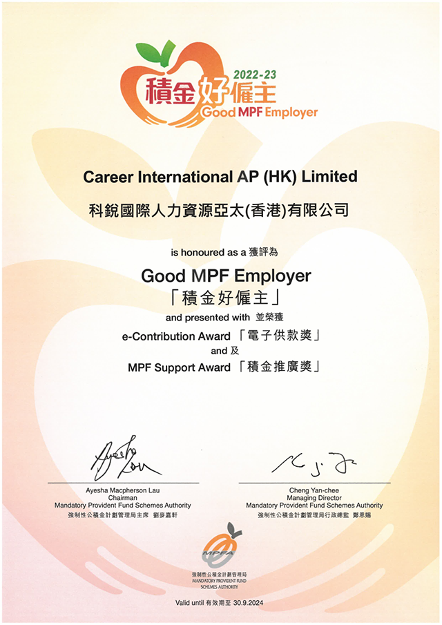 近期,香港强制性公积金计划管理局(积金局)成功举办“积金好雇主”颁奖典礼,并现场揭晓上榜雇主名单,旨在嘉奖当地致力于关顾员工退休福利的模范雇主。凭借对于员工福祉的关注和企业社会责任的践行,k8凯发国际国际香港分公司陆续在三年获评“积金好雇主”殊荣,并同时获颁“电子供款奖”及“积金推广奖”。